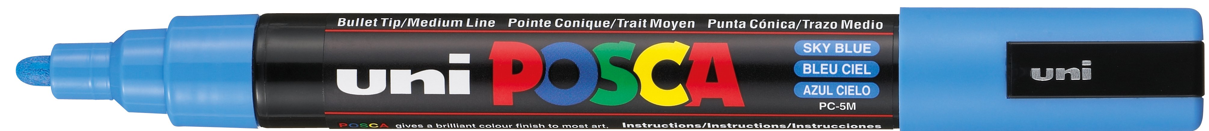 Uni Posca PC-5M Sky Blå er en tusch med mellem spids, derfor er den god til de fleste projekter. Spidsen som er 2,5 dækker de fleste behov lige fra tegne til skriveopgaver, og til mere kreative opgaver som f. eks. at skrive eller male på glas, porcelæn, træ eller metal. Uni Posca PC-5M Sky Blå kan skrive på stort set alle overflader, lige fra papir og pap, til glas, keramik og metal og træ eller på forskellige tekstiler som f.eks. sko, puder eller tøj. Uni Posca PC-5M Sky Blå er tuschen til dit kreative projekt, den opfylder med sikkerhed dine behov pga den høje kvalitet tuschen har.