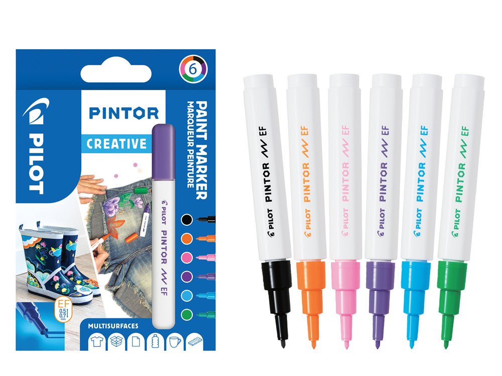 Pilot Pintor er den ultimative DIY-pen. Vil du give dit tøj et nyt look, personliggøre et objekt eller dine møbler, eller dekorere porcelæn, plastik, glas, metal etc.? Pilot Pintor gør alle dine ideer mulige på alle materialer. Perfekt til tegning, farvelægning, dekoration, mærkning, skrivning, kalligrafi og meget mere. Fås i flere sjove farver og fire størrelser : Ekstra Fin (spidsbredde 2,3 mm / stregbredde 0,5-07 mm), Fin (spidsbredde 2,9 mm / stregbredde 0,9-1,5 mm), Medium (spidsbredde 4,5 mm / stregbredde 1,5-2,2 mm) og Bred (spidsbredde 8,0 mm / stregbredde 4,0-8,0 mm). Ultra-dækkende blæk Pigmentrig vandbaseret blæk Multi-overflade Farver som kan blandes og give uendelige nuancer Blækket bliver permanent, hvis du stryger stoffet. Pakke med 6 assorteret farver i Ekstra Fin: sort, orange, pink, violet, lyseblå og lysegrøn.